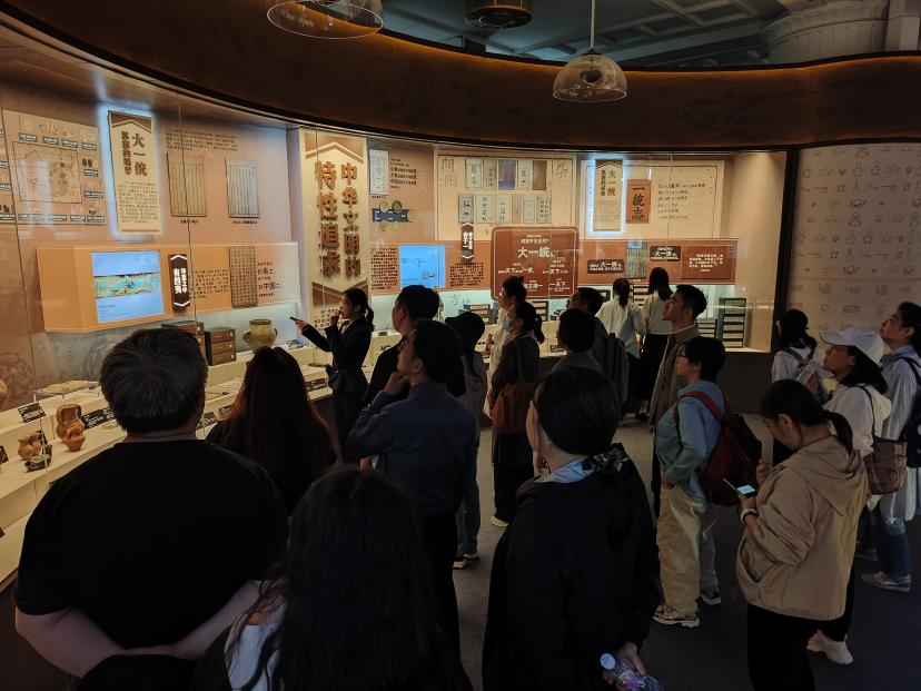 探寻“大一统”思想的历史渊源:活动伊始,师生们跟随专业讲解员,踏入民族文化宫的展览核心展区——“大一统”。这里陈列着从商周青铜器铭文到秦汉简牍,从唐宋典籍到明清文献等珍贵文物,它们如同一颗颗璀璨的明珠,串联起中华文明“大一统”思想从萌芽到成熟的发展历程。在讲解员的细致讲解下,师生们驻足于甲骨文“天下”概念的初现处,感受着古人在龟甲兽骨上刻画出的对世界的最初认知;又在汉代“六合同风”的治国理念展品前,领略到那个时代的宏大格局与政治智慧。通过这些珍贵的文物古籍,师生们深刻认识到“大一统”不仅是疆域的统一,更是文化认同与精神凝聚的历史积淀,这一思想贯穿中华民族的发展历程,成为维系国家统一和民族团结的精神纽带。