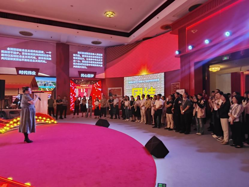 凝聚团结奋进的磅礴力量:步入“大团结”展区,新中国成立后民族团结进步的历史文献、影像资料和实物见证映入眼帘。尤其是党的十八大以来,党和政府在推动民族地区发展方面取得的丰硕成果,让师生们深切感受到在党的领导下,各族群众守望相助、携手共进的深情厚谊。展览结尾处,一场精彩纷呈的民族特色歌舞展演将活动氛围推向了高潮。各民族的演员们身着华丽的民族服饰,载歌载舞,用热情的表演展示了中华民族丰富多彩的文化魅力和团结向上的精神风貌。师生们沉浸其中,共同感受着文化共融之美,深刻体会到中华民族一家亲的温暖与力量。