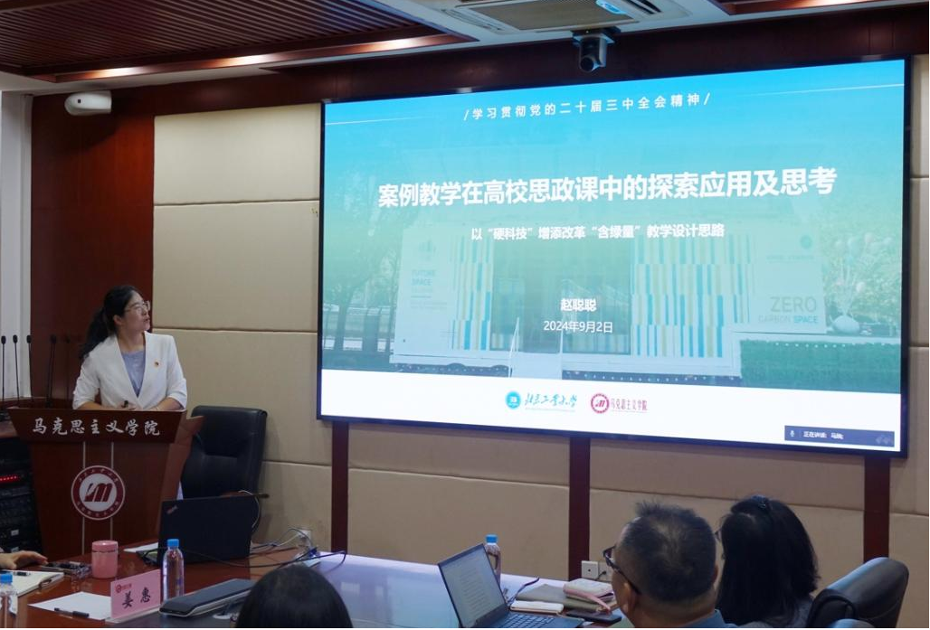 集体备课会包括示范教学和交流研讨两个环节,经理丁云主持了集体备课会。首先,青年教师赵聪聪以《用“硬科技”增添改革“含绿量”》为题做教学示范和经验交流。赵老师以北工大“零碳小屋”为教学案例,生动讲述了公司师生通过科技创新助力发展新质生产力的故事,阐述了背后蕴含的科技创新、绿色发展、生态文明建设和人才支撑等理论内涵,为大家上了一堂有高度、有深度、有活力的高质量示范课。示范教学后,赵老师和大家分享了本次示范教学采用的“一案到底”设计思路以及先后参加北京市教工委、教育部举办的集体备课会的体会。随后,思政课课程负责人及教师代表立足各门课程特点和教学改革创新思路,围绕党的二十届三中全会精神如何融入思政课做了交流研讨。