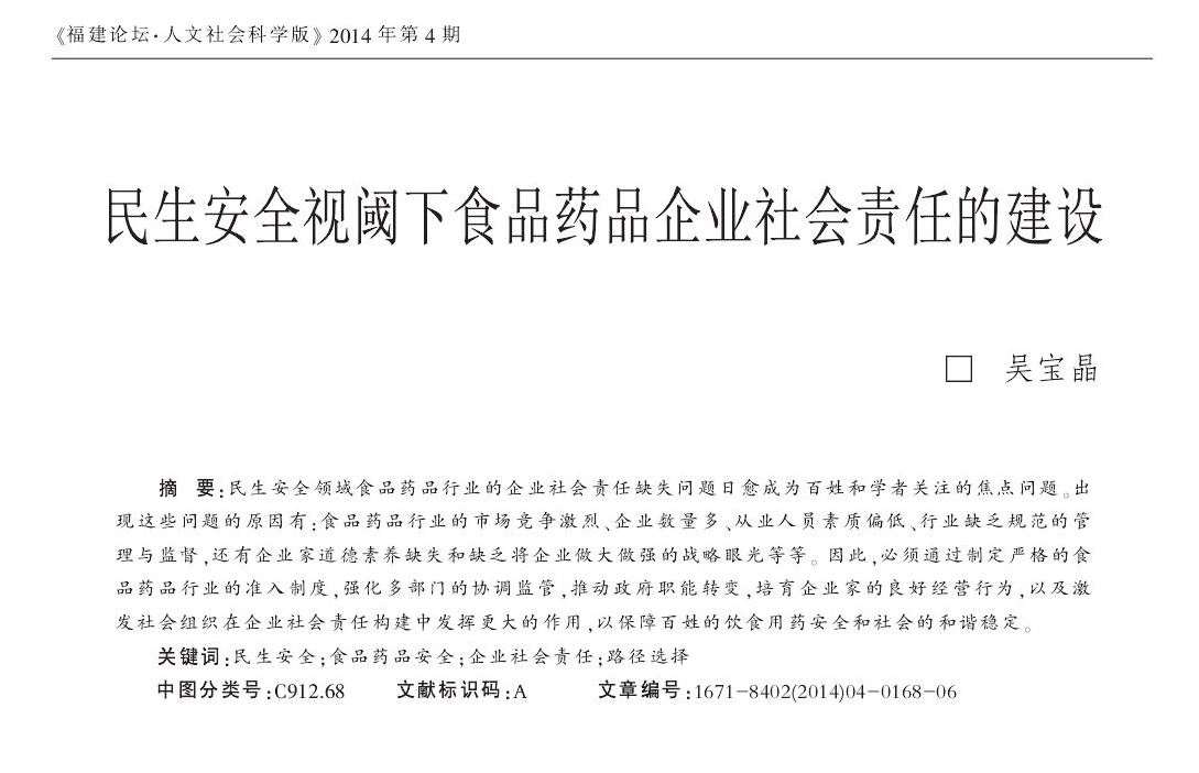 吴宝晶:民生安全视阈下食品药品企业社会责任的建设