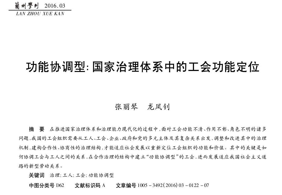 张丽琴、龙凤钊:功能协调型国家治理体系中的工会功能定位