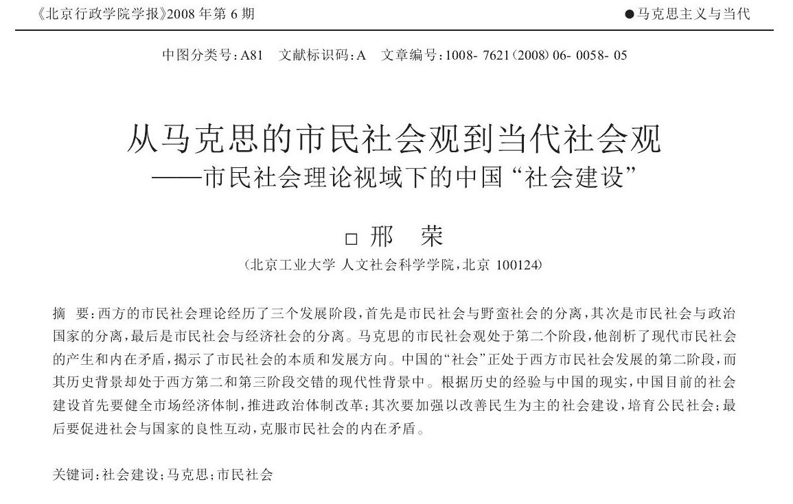 邢荣:从马克思的市民社会观到当代社会观———市民社会理论视域下的中国“社会建设”