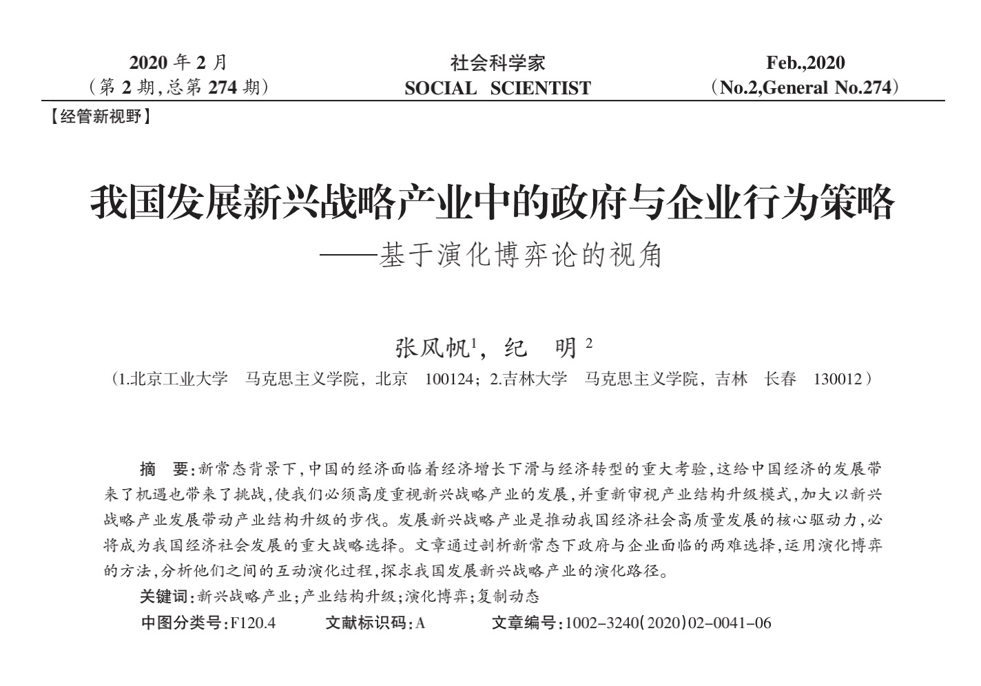 张风帆 纪明:我国发展新兴战略产业中的政府与企业行为策略——基于演化博弈论的视角
