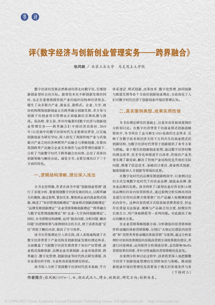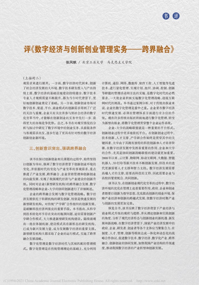 张风帆:评《数字经济与创新创业管理实务——跨界融合》