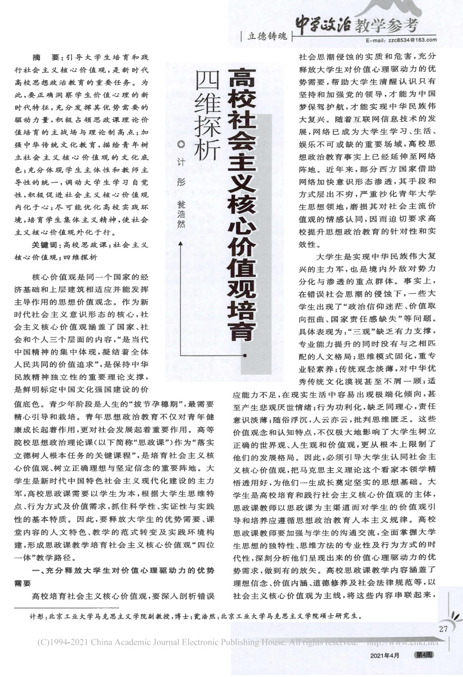 计彤 翁浩然:高校社会主义核心价值观培育四维探析