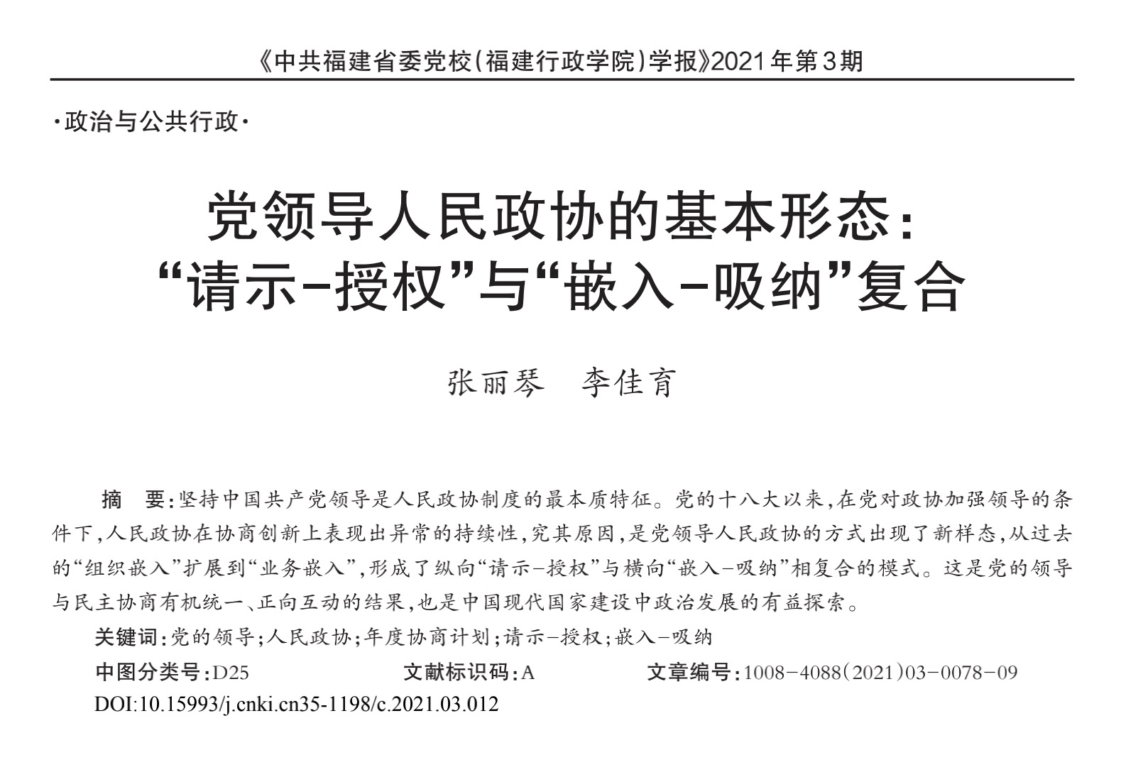 张丽琴 李佳育:党领导人民政协的基本形态:“请示-授权”与“嵌入-吸纳”复合