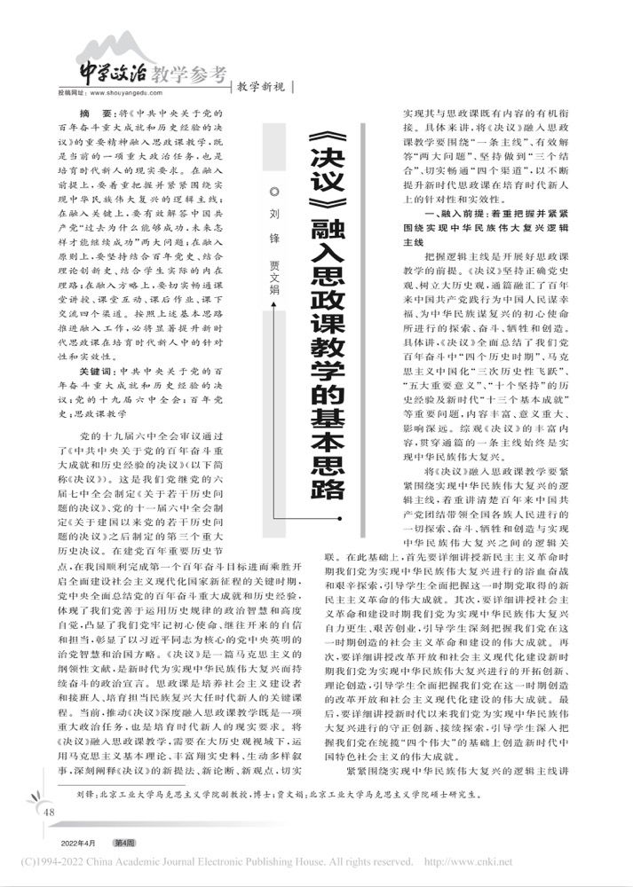 刘锋 贾文娟:《决议》融入思政课教学的基本思路