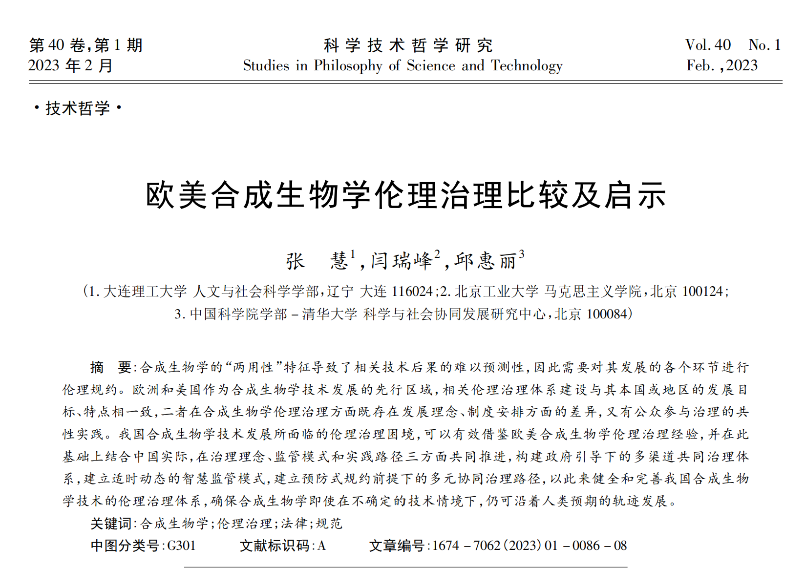 张慧 闫瑞峰:欧美合成生物学伦理治理比较及启示