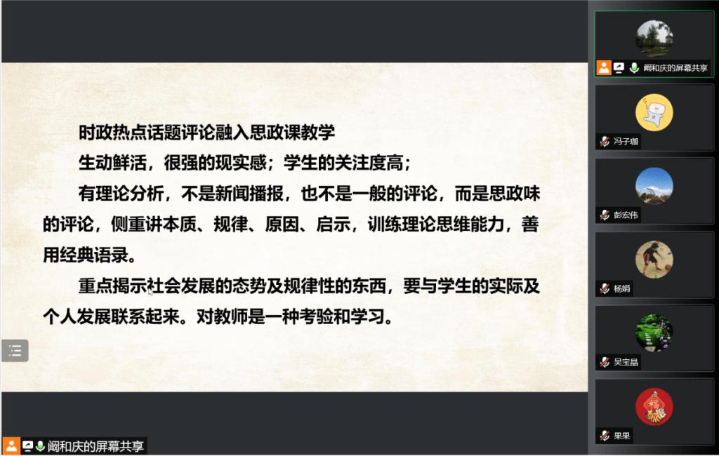 在交流分享环节,吴宝晶老师、彭宏伟老师、阚和庆老师、董静老师、刘锋老师、赵聪聪老师、常婧老师、葛宏老师、杨娟老师、冯子珈老师、李辰洋老师分别结合本学期各自教学科研工作,梳理阶段性的学习、教学、科研成果,分享了新的做法、体会和收获,总结经验、凝练问题。