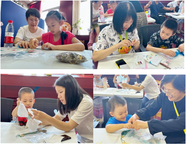 活动开始,首先是青工造物的赵老师给大家讲解“香囊”的由来与含义。香囊中的香料主要有祛灾辟邪之用,为孩子制作和佩戴香囊往往饱含着父母对孩子的浓浓爱意。然后,在赵老师的指导下,小朋友和爸爸妈妈们一起动手,有的帮忙穿针引线,有的负责细心缝制,有的帮助装填香料,有的负责装置彩绳。每一个步骤,都有条不紊;每一针每一线,都认真专注。经过半个多小时的努力,每一个家庭都制作完成了一个精美的香囊。