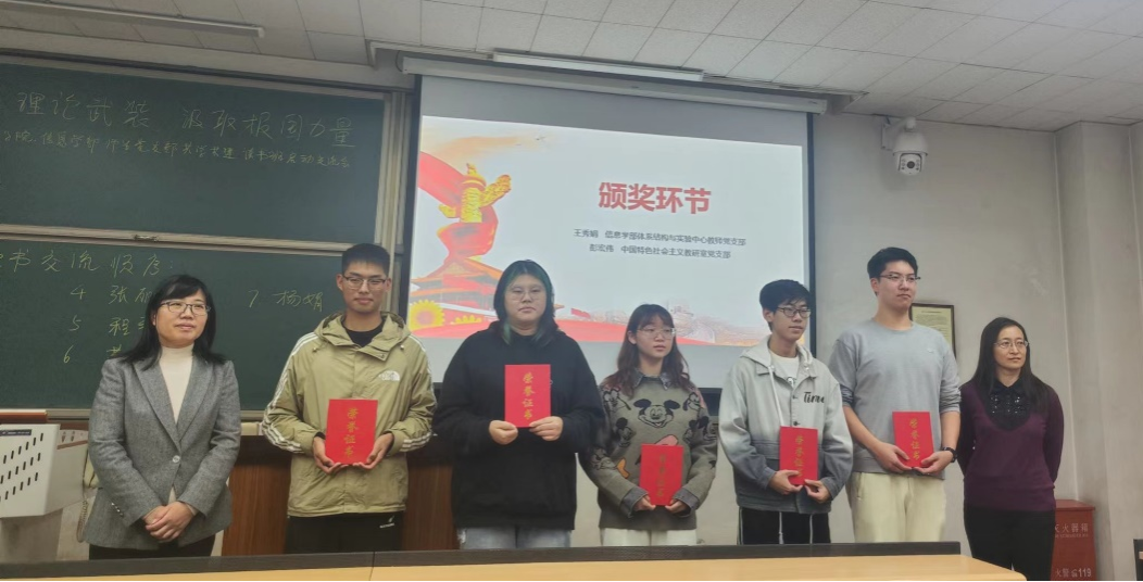 评分颁奖环节,yl23411永利中国特色社会主义教研室党支部姜海珊老师和信息学部体系结构与实验中心教师党支部王秀娟老师共同为演讲同学颁发获奖证书,并鼓励他们继续努力学习,为新时代祖国发展贡献青春力量。