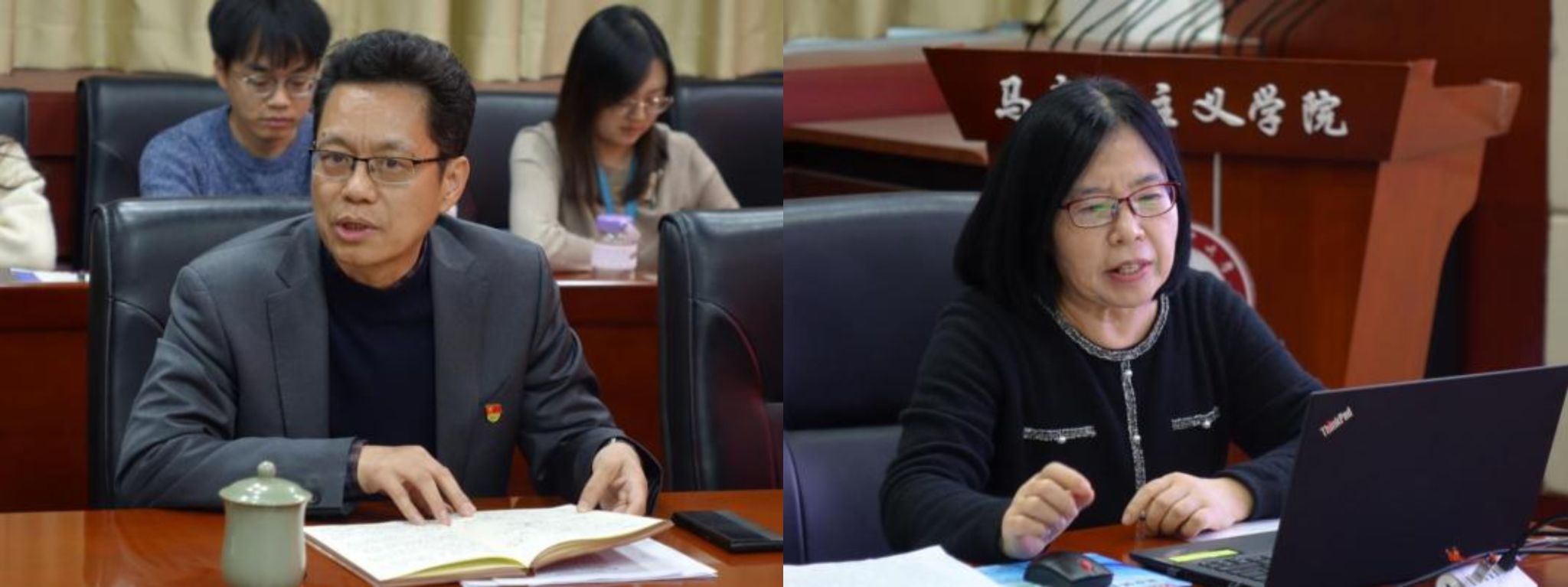 工会教代会负责人姜惠从“党政重视工会教代会工作,积极推动民主政治建设”、“依法维护教职工权益”、“加强思想政治引领,提高教职工队伍水平”、“加强服务教职工水平,健全工会组织建设”、“不足与整改”方面进行了年度工会教代会工作汇报。教师代表闫瑞峰、陈伶俐、杨桦、沈震分别从自身教学科研工作出发,从理论文章撰写、科研项目申报、青年教师发展、教学能力提升等不同视角进行了工作经验分享和交流。
