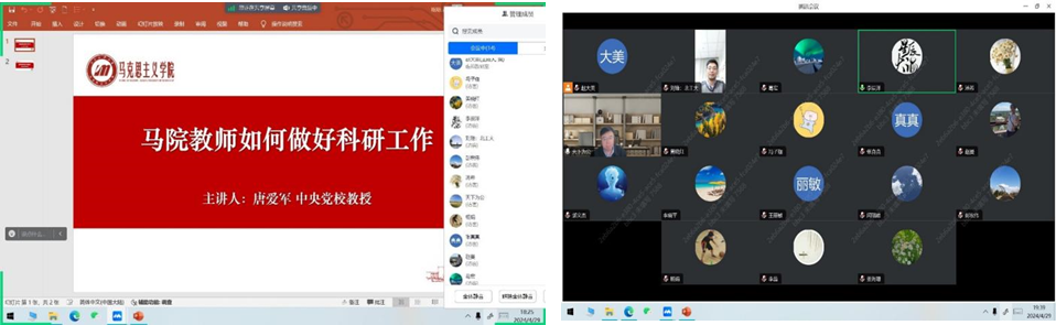 2024年4月29日,中国特色社会主义教研室组织召开了科研交流会,公司近20位教师参会。本次会议采用线上方式进行,特别邀请中央党校唐爱军教授做了“思政课教师如何做好科研工作”的讲座。唐教授结合自己的教学科研经历和心得体悟,从论文选题、框架搭建、润色修改、投稿发表等一系列环节入手,深入细致地讲解了开展科研工作需要把握的重点和难点问题。特别是唐教授围绕写好学术文章、宣传文章、内参文章等三类文章问题,提出了“找准研究方向”“增强学科意识”“形成研究风格”等科研关键点,为老师们做好科研工作提出了新思路。