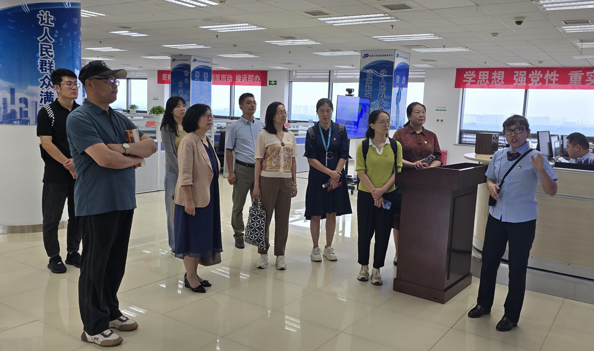 为深入学习贯彻党的二十届三中全会精神和习近平总书记视察北京重要讲话精神,落实北京市教工委、教委关于推动“接诉即办案例进高校”要求,推动“大思政课”高质量发展,2024年9月4日上午,中国特色社会主义教研室党支部及联系院领导一行10人到北京市政务服务和数据管理局北京市民热线服务中心进行实地参观调研。