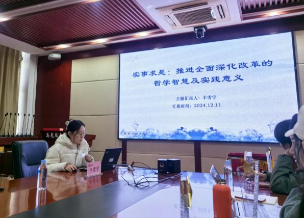 2023级马克思主义基本原理方向丰雪宁同学以“实事求是:推进全面深化改革的哲学智慧及实践意义”为题,阐述了实事求是思想的重要地位。习近平总书记强调:“实事求是,是马克思主义的根本观点,是中国共产党人认识世界、改造世界的根本要求,是我们党的基本思想方法、工作方法、领导方法。不论过去、现在和将来,我们都要坚持一切从实际出发,理论联系实际,在实践中检验真理和发展真理。”在进一步全面深化改革的过程中,仍要坚持实事求是的原则,准确把握社会主要矛盾,进行调查研究,大胆试验探索,并处理好改革中的各种关系,确保改革沿着正确的方向前进。