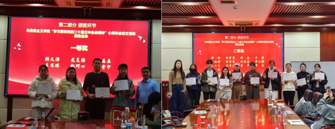 交流会召开前进行了征文活动。同学们积极参与、认真撰写,涌现出了一批优秀的作品。经过评审,评选出了特等奖3名、一等奖6名、二等奖 13名,在活动伊始对获奖者进行了表彰,公司为获奖的同学颁发了荣誉证书和奖品,并对他们的学习成果给予了高度评价和肯定。获奖同学纷纷表示,将以此次活动为契机,继续深入学习党的创新理论,不断提高自己的政治素养和业务能力,为学习研究阐释党的二十届三中全会精神贡献力量。