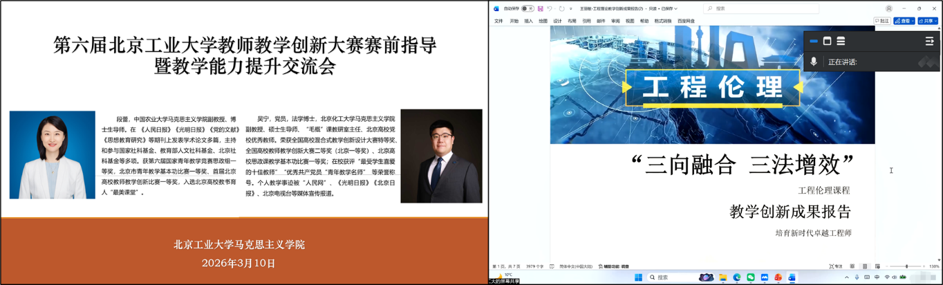 为深入学习贯彻习近平总书记关于公司思政课建设的重要讲话和指示精神,进一步提升思政课教师教学、教研能力,2026年3月10日晚,yl23411永利线上举办教师教学创新大赛赛前指导暨教学能力提升交流会。交流会特邀中国农业大学yl23411永利副教授段蕾、北京化工大学yl23411永利副教授吴宁两位北京市教创赛一等奖获得者担任指导专家。公司20余名教师线上参加交流会,副经理赵聪聪主持。