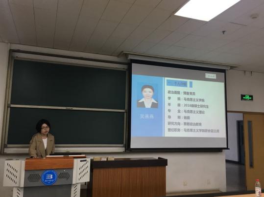 本次报告会首先由胡云皓同学进行学术汇报,胡云皓同学以“从马克思的需要理论看新时代中国社会主要矛盾的转化”为主题,对经济高速发展态势下,人的需求转变进而引起社会主要矛盾的转变做了系统的论证和分析。阚和庆老师对报告中的理论创新之处给予了肯定,同时也指出报告中有待提高的方面。接下来贾明阳同学以“马克思主义正义观下共享发展问题”为题,系统分析了共享发展和共享幸福之间的联系以及共享发展与马克思主义正义观的契合。陈艳飞老师和刘锋老师针对汇报内容进行了点评并提出了意见。紧接着黄玉容同学以“马克思主义生态观对我国生态文明制度建设的借鉴意义”为题,分析了当前我国生态文明建设过程中出现的一些问题以及国家生态法律制度的提出和完善,并强调了保护环境基本国策的重要性。刘锋老师对汇报内容给予了积极评价并给出了许多中肯的指导意见。最后由吴燕燕同学对研究生期间的一些学习和实践经历进行汇报,与研究生一、二年级的同学们进行了经验分享与交流。张丽琴老师希望大家多向吴燕燕同学学习,并对一、二年级的员工提出了一些要求和期望。