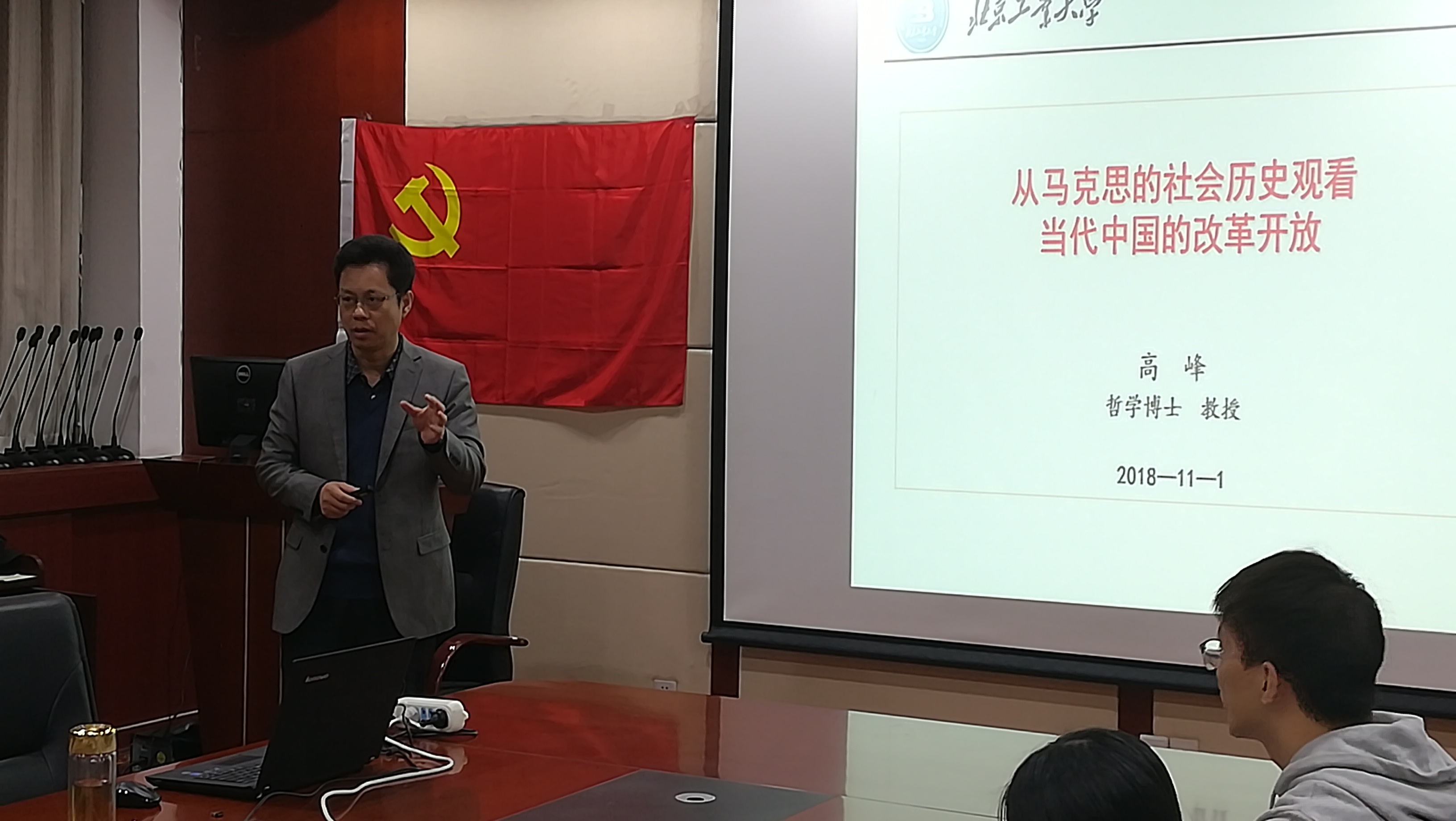 2018年11月1日下午6时,yl23411永利研究生党支部在人文楼710会议室举办第二次集体党课学习活动。此次党课由公司党总支副书记兼副经理高峰老师主讲。他以“从马克思的社会历史观看当代中国的改革开放”为题,为全体党员和入党积极分子进行了相关问题的讲解。