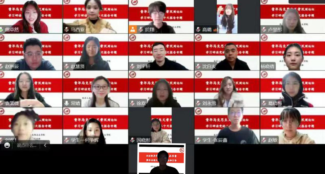 2022年10月17日,2022级马克思理论研究生通过线上形式召开青年马克思主义者双周论坛。此次双周论坛的主题为“学习党的二十大报告,研读‘六个坚持’的深刻含义”,论坛采取员工分组研讨、汇报及讨论,教师点评及提问的方式开展。本次论坛由2022级研究生曲卓然主持,邀请公司党委书记高峰教授、公司党委副书记兼副经理沈自友老师、2022级班主任常婧老师参加,2022级全体硕士研究生参加。