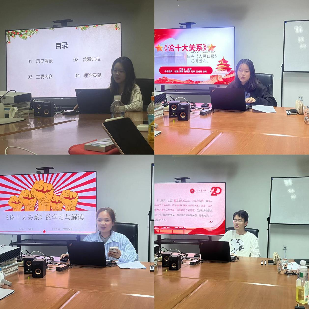 马克思主义基本原理方向由徐欢同学进行汇报,徐欢同学从《论十大关系》的时代背景、主要内容进行了讲述,在时代背景中重点突出了时代发展的必然性、形成上的偶然性的两大方面,内容方面详细讲述了十大关系的深刻内涵。最后从专业角度方向分析了《论十大关系》中内蕴的辩证思维,协调发展思想。正确处理矛盾的普遍性与特殊性,不仅是党的事业发展的一项重要任务,也关系民生福祉。而《论十大关系》也充分彰显了“统筹兼顾”“综合平衡”等建设社会主义的协调发展思想。