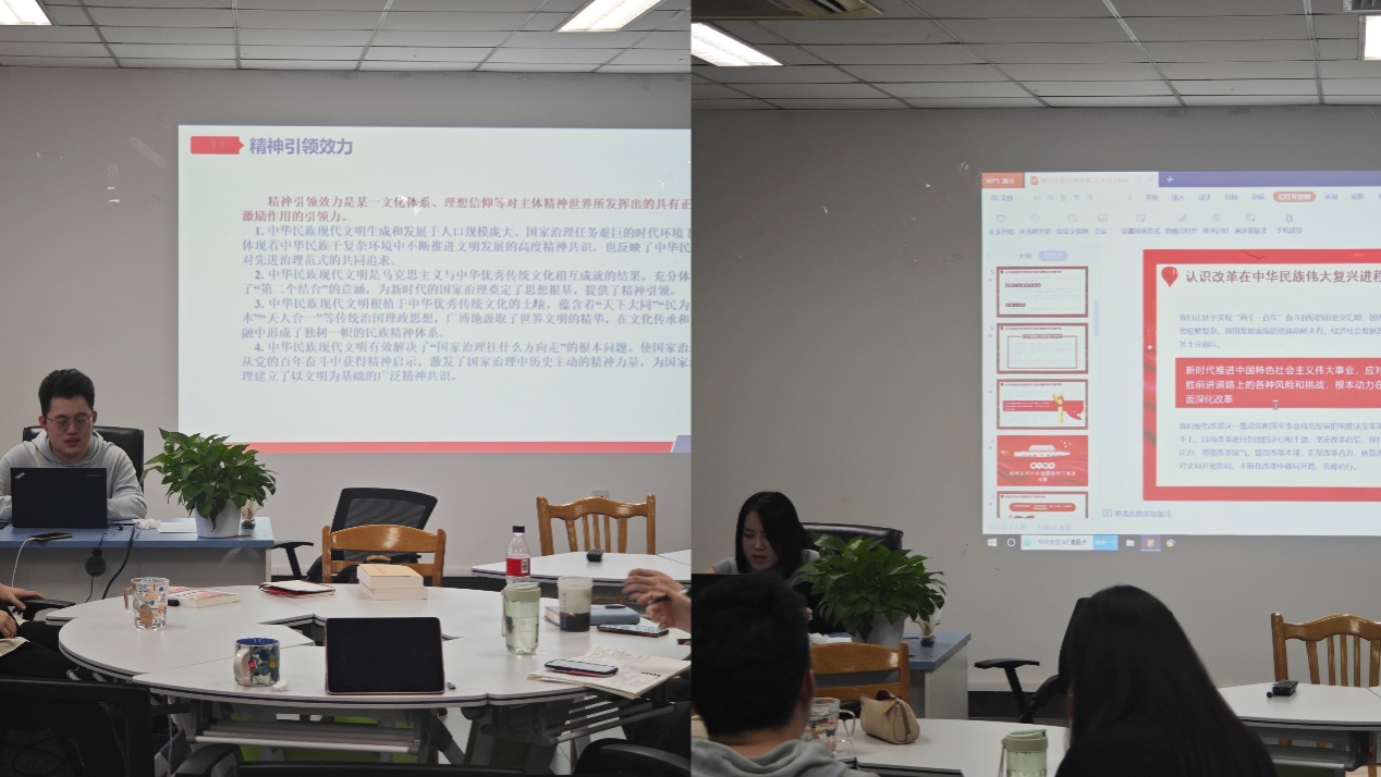 赵翀辰、刘永雪、於翔、徐欢分别结合阅读文献及主题并围绕“全面深化改革开放”展开论述。赵翀辰选取全面深化改革开放中国家治理能力现代化这一重点,以“中华民族现代文明的国家治理效力”为题,从中华民族现代文明蕴含效力及发挥效力的时代境遇这两方面进行了深刻阐释;刘永雪以“推动全面深化改革实现新突破”为题,引用习近平总书记的系列重要讲话,阐发了改革在中华民族伟大复兴进程中发挥的关键作用以及改革开放继续走深走实的未来方向。於翔则以“对内改革,对外开放”为题,对什么是全面深化改革开放,为什么要全面深化改革开放,如何全面深化改革开放和改革与开放的辩证关系这四个部分展开论述,从经济领域的视角诠释了改革与开放这一对相互促进相互影响的关系。徐欢以“全面深化改革开放满足人民美好生活需要的三重维度”为题进行讲述。从价值维度出发,全面深化改革开放的出发点是为了满足人民美好生活需要;从主体维度出发,人民群众是在全面深化改革开放中破除不平衡、不充分发展问题的主要依靠 ;从方法维度出发,全面深化改革开放满足人民美好生活需要必须汇聚民智民力。