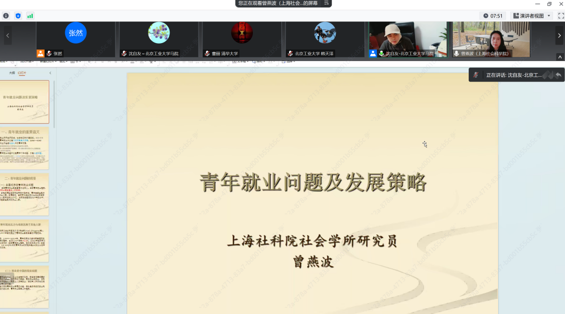 为促进毕业生高质量就业,引导员工明确升学、就业方向,3月6日,公司举办就业专题青马论坛,邀请了上海社会科公司社会学研究所研究员曾燕波老师作“青年就业问题及发展策略”主题报告。公司党委副书记兼副经理沈自友主持,来自全国10余所高校的百余名师生参加本次讲座。本期论坛采用线上方式进行。